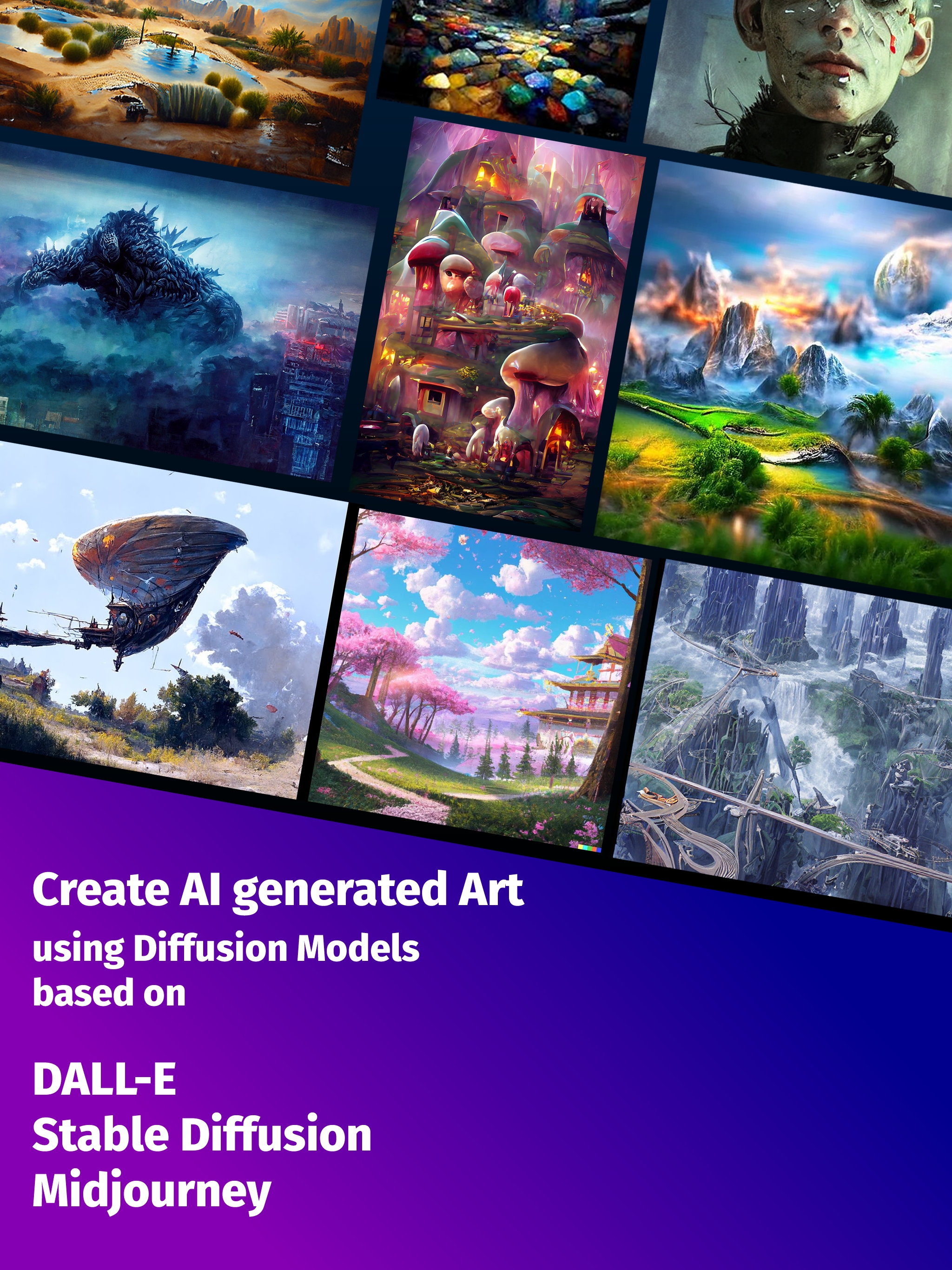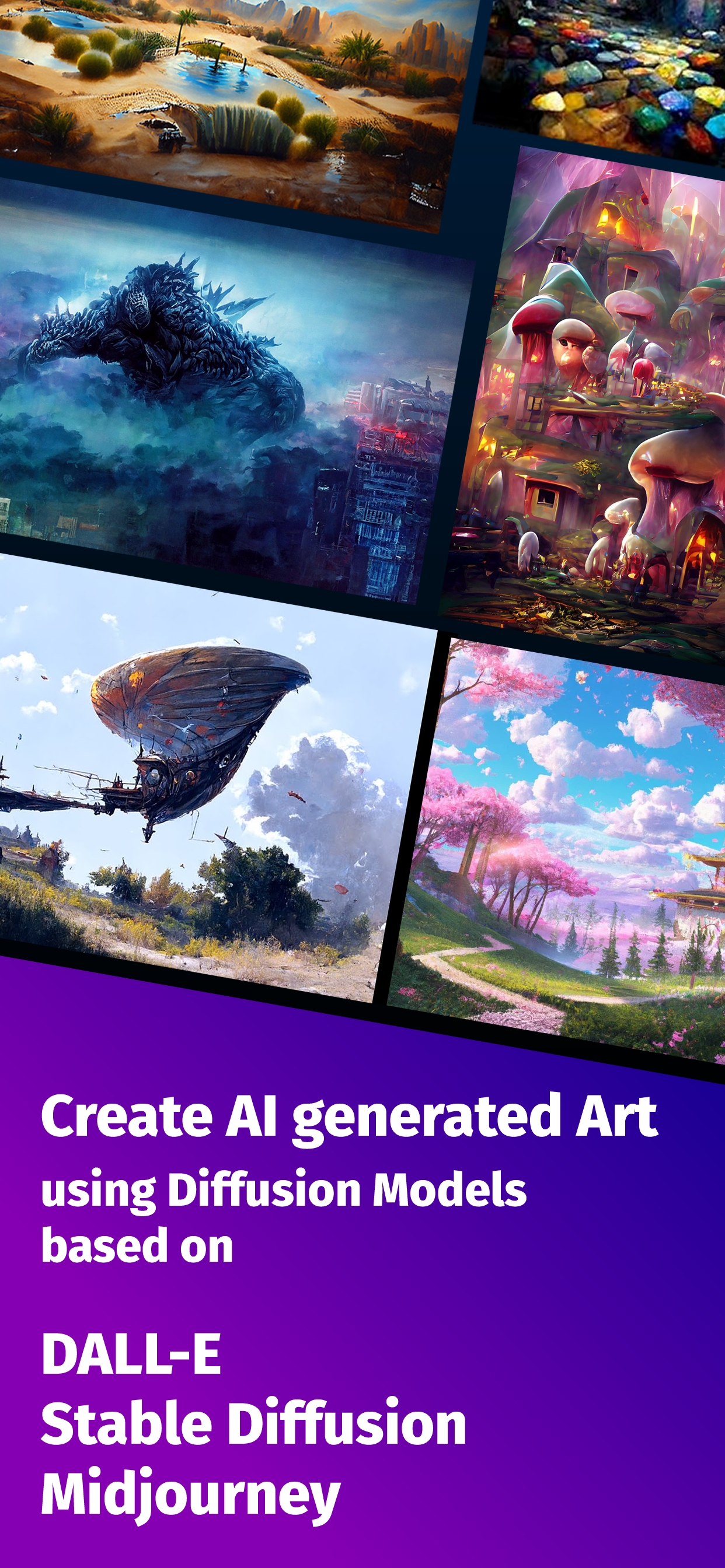 Create AI generated art using the power of newest diffusion AI models based on technologies similar to DALL-E, Stable Diffusion, and Midjourney