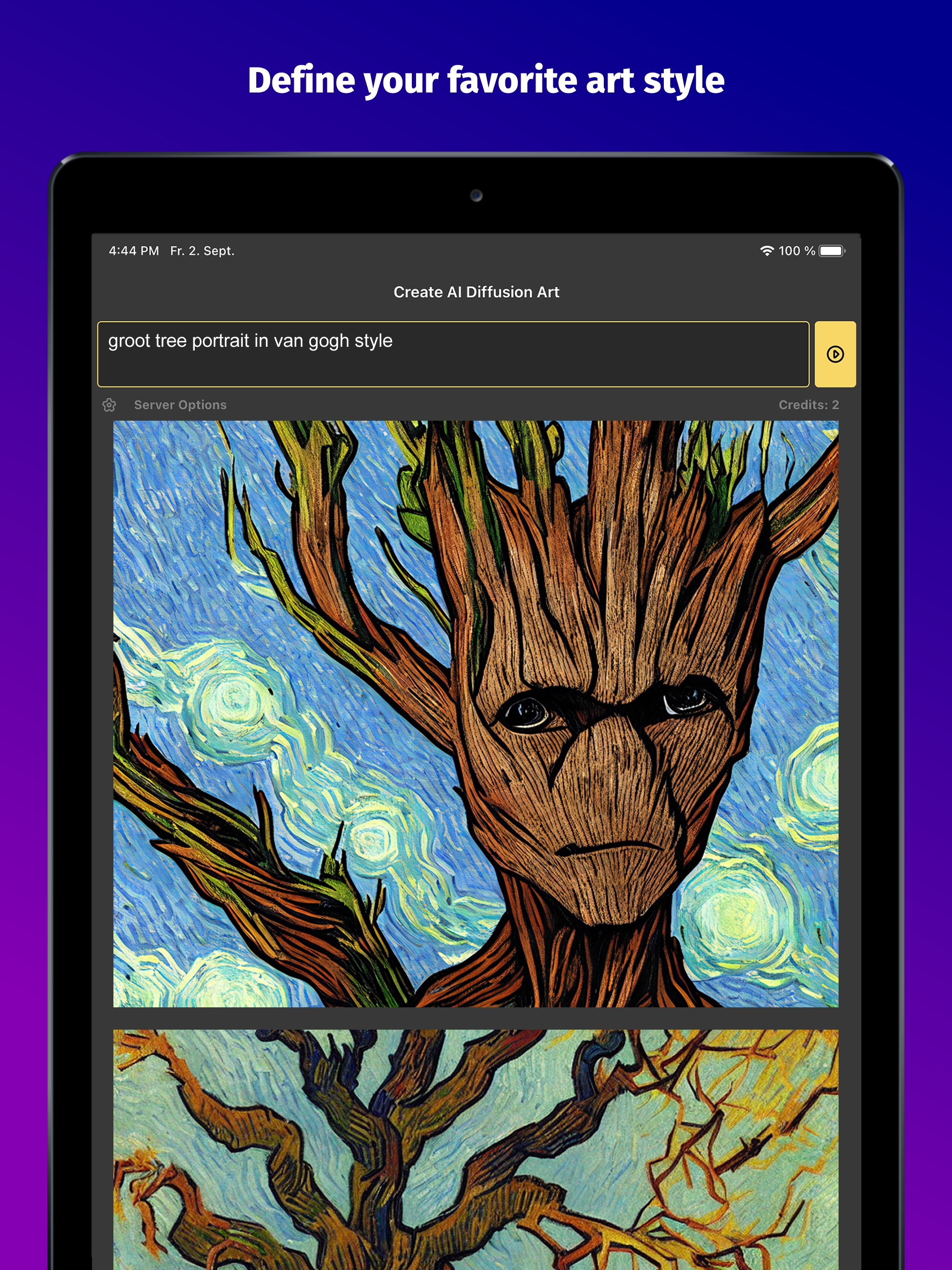 Simply describe your topic as a text prompt, such as "asian landscape with mountains and water when sun sets down" or "groot tree portrait in van gogh style" and let the AI generate matching images.